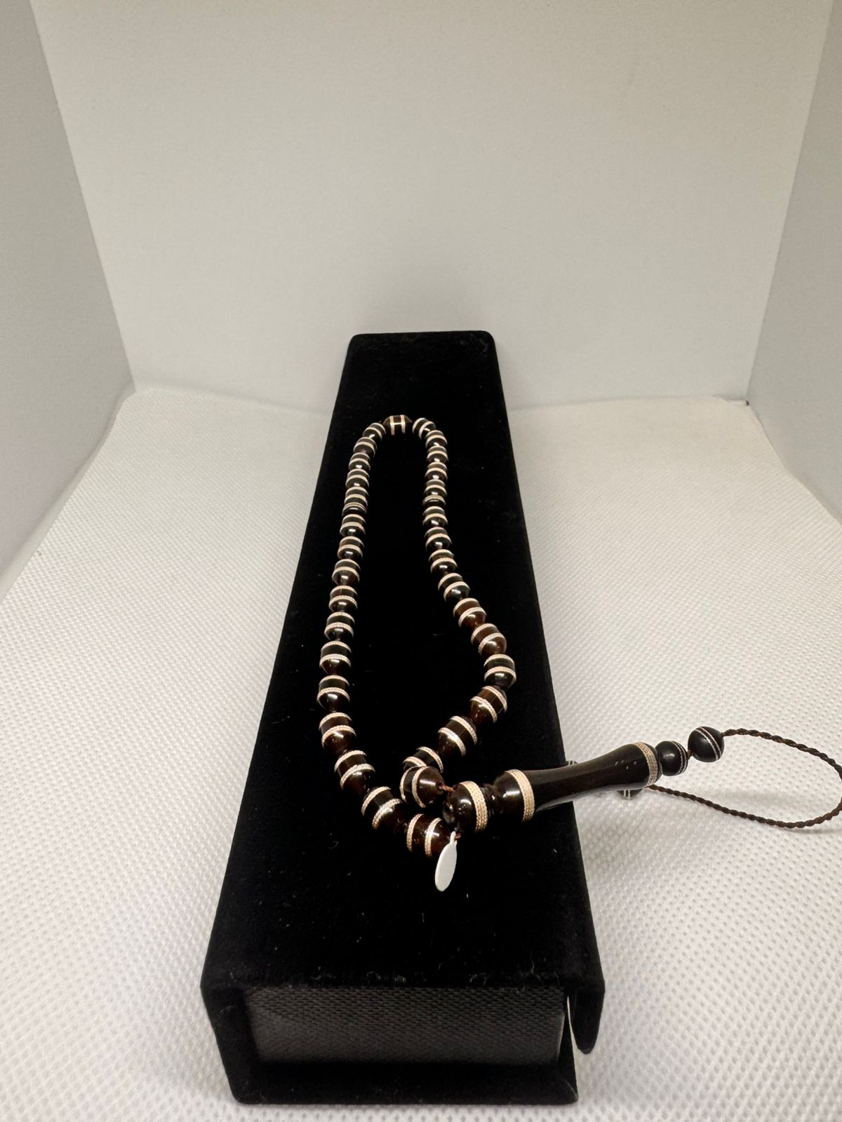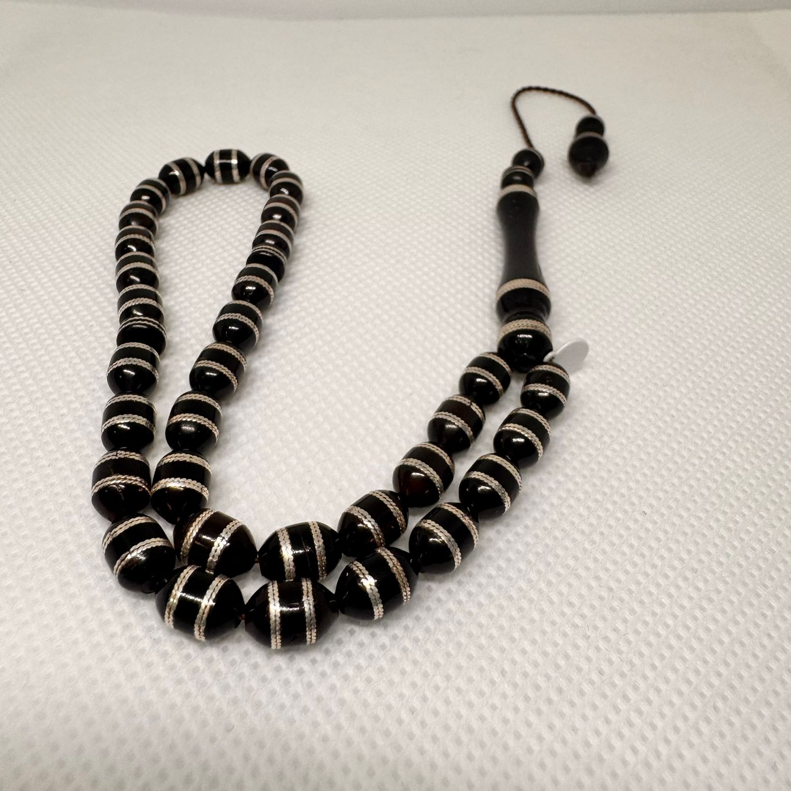 تأتي هذه السبحة الفاخرة بتصميم استثنائي يجسد روح الأصالة والفخامة مع لمسات الفضة على طرفي كل خرزة .