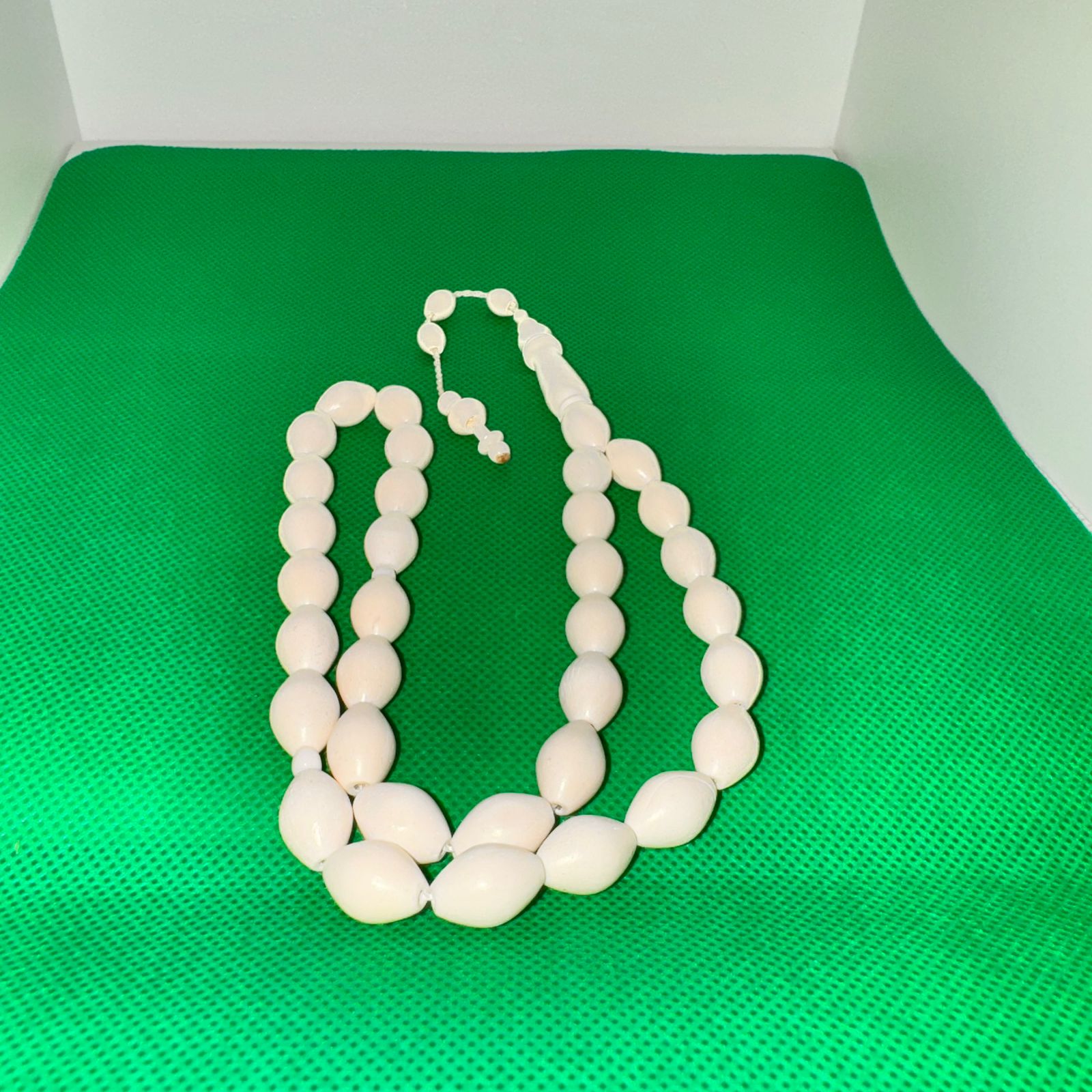 تظهر جماليات العظم الطبيعي في لون الخرز الأبيض المميز حيث تتفاوت درجاته بشكل طبيعي مما يضفي على كل سبحة طابعًا فريدًا غير مكرر. ومع كثرة الاستخدام، تزداد نعومة الخرز ويصبح ملمسه أكثر راحة، ما يجعلها خيارًا مفضلًا لمحبي السبح التقليدية ذات الجودة العالية.