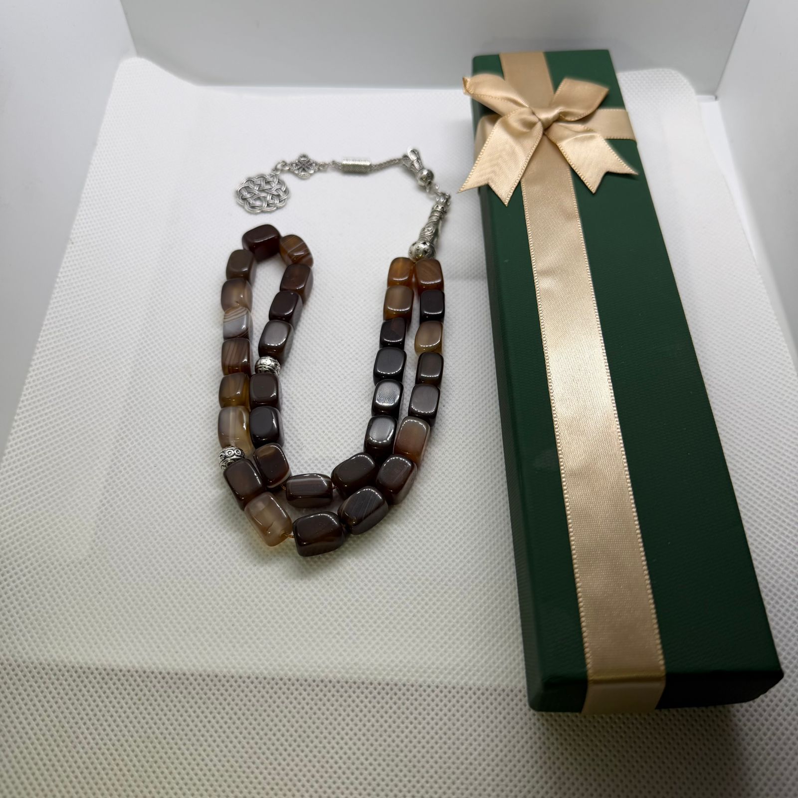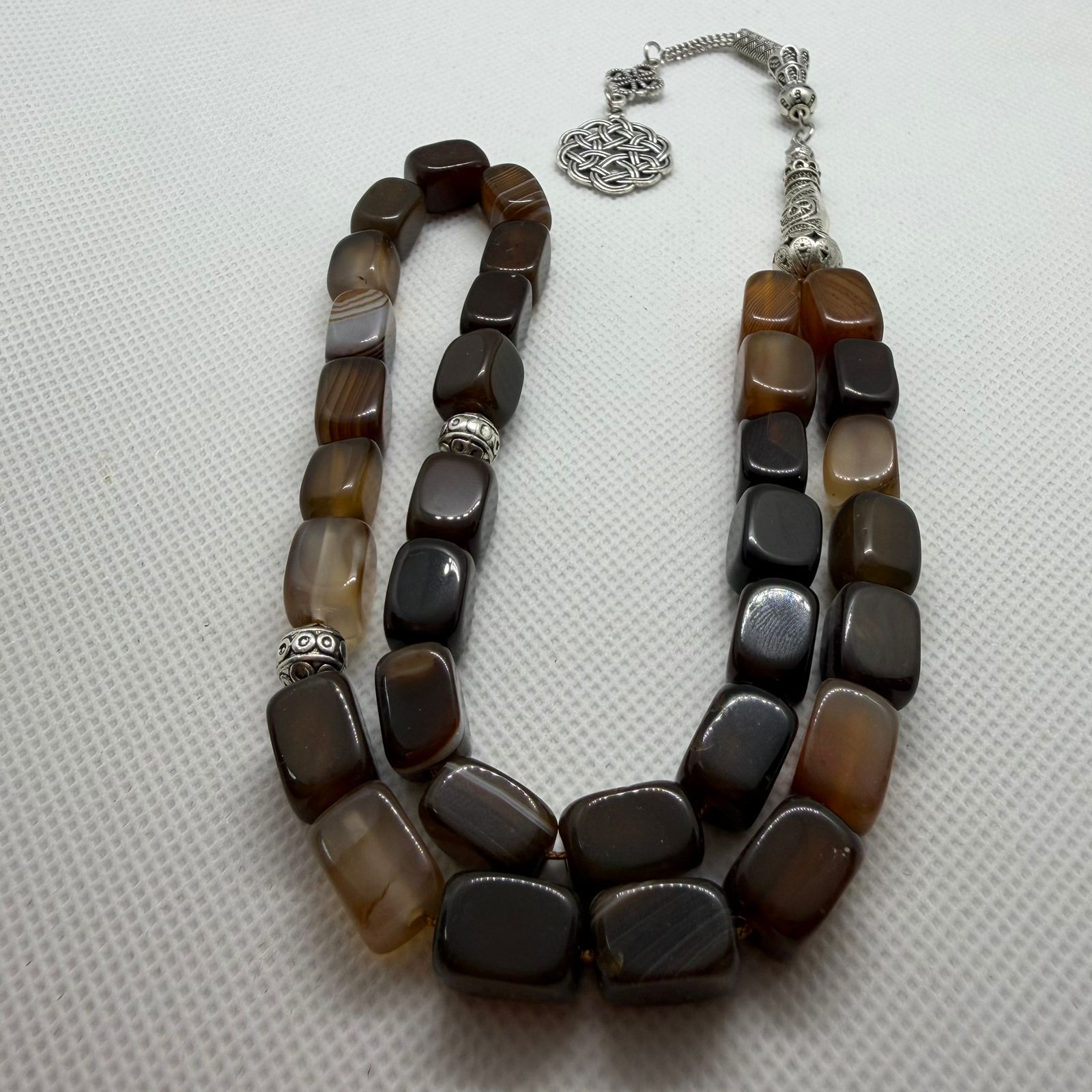 سبحة عقيق رائعة بتصميم رائع ونادر مكونة من 33 خرزة قطر كل منها 11 ملم وتأتي بمجموعة جذابة وداكنة من الألوان.